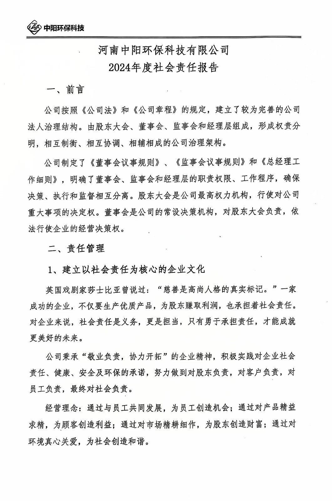 >河南中陽環保科技有限公司2024年度社會責任報告
